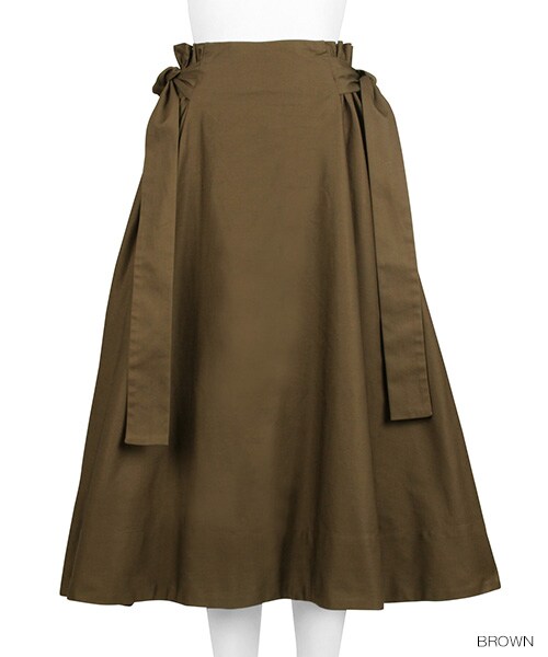 素材:綿100%ウエストにたっぷり入ったギャザーがポイントのフレアスカートです。Aラインになるよう、裾のボリューム感にこだわりました。両サイドはリボン結びではなく、あえて一度だけラフに結ぶことで、ガーリーになりすぎず上品に着ていただけます。
