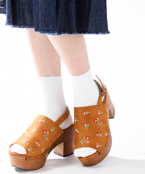 アッパー部分に花柄刺繍を施したサンダル。重厚感のあるウッドソールが着こなしのアクセントになります。つま先から足元までしっかりとホールドしてくれ、歩きやすいのが特長。インソールにはクッションが入っているので履き心地も快適です。定番の合わせやすさはそのままにデザインで違いを持たせたひと品。今季トレンドのデニムと合わせたカジュアルなコーディネートや、スカートやワンピースと合わせたフェミニンなコーディネートなど、幅広いアイテムと相性抜群です。素足で履いて頂くのは勿論、今季はソックスを合わせた着こなしもオススメです。M=23.5㎝相当L=24.5㎝相当※履き方・足型等、個人差がございますので、あくまでも参考程度にお考え下さいませ。 ■厚底靴に関しての注意事項■※ファッション性を重視した商品の為、履きなれない状態での長時間の着用はお控え下さい。※歩くために必要な強度を保持している商品ではありますが、走る・跳ねる等の行為をとられた場合、瞬間的に想定以上の負荷がかかり商品が破損する恐れがありますのでご注意ください。※足を捻る・挫くなどして転倒しかけた際、場合によっては骨折等の大きな怪我を回避する為にバンドの引き抜けや底材の剥離が発生する事がございます。※段差や傾斜を歩行される際はご注意下さい。※足首を痛める恐れがある為、厚底靴やヒールの高い靴を着用しての自転車のご利用はお控え下さい。※厚底靴を着用した状態でのお車の運転は各都道府県の条例により禁止されています。お車を運転される場合は厚底靴の着用はおやめ下さい。
