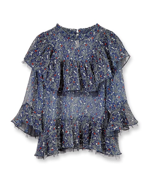 チュール素材を組み合わせ、女の子らしさを演出します。 胸元や裾、袖口のボリューミーなラッフルがデザインポイント。 気になる部分もさりげなくカバーしてくれます。 ネックにも小さめなフリルがついた、flowerにしかない贅沢ブラウスです。 女性らしい絶妙な色味のPNKと、小花柄が可愛らしいNVYの二色展開です。 細めのパンツで合わせるとコーデバランスが絶妙に決まるのでおすすめです。