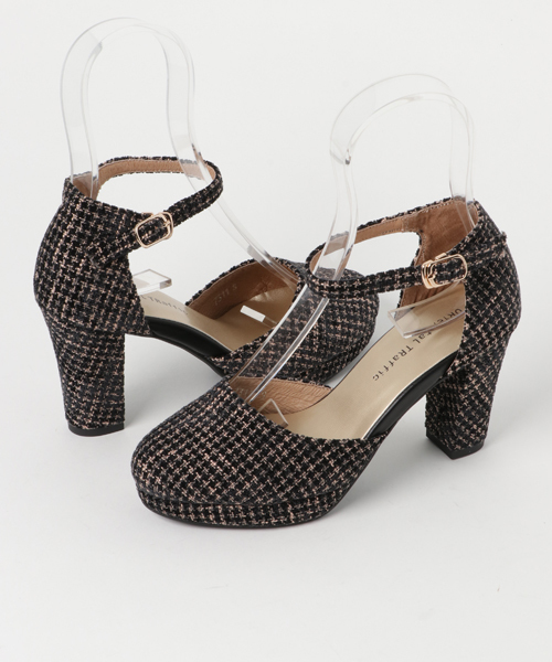 華奢なストラップと高めヒールで、美脚効果抜群の1足。ストームがあるので、高めのヒールが苦手な方にもオススメ。サイドの抜け感で、タイツやソックス合わせも楽しめる。使いやすいブラックに加え、スモーキーなパープルと、ツイード素材は合わせるだけで秋冬らしい足元に。【オススメPOINT】◇丸みのあるシルエットで可愛らしい◇ストラップとストーム付きで歩きやすさ◎