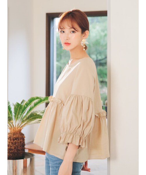 トレンドライクなバルーンスリーブ デザインでこなれたブラウス。 無地なのに華やか! 全体的に愛らしい雰囲気が魅力ポイントです。 何よりもバルーンスリーブのディテ―ルが 洗練美UP!大人可愛いシルエットを演出します。 コットンの丈夫な質感も素敵! 薄くて、余裕あるフイット感が自慢!より涼しく着れます。 ナチュラルに広がるヘムのフレア上品さを高めます。