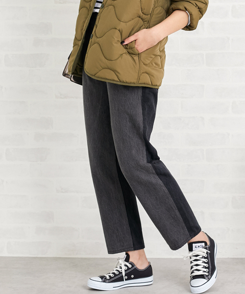 今旬のリメイクデニムに新作が登場。フロントとバックでバイカラーにしたカラーリングとポケットを外したようなデザインはユーズド感もあり、こなれた印象を引き出せます。履き心地も柔らかいデニムを使用しているので、ついデイリーに着まわしてみたくなるはず。裾に向かってすとんと落ちるストレートシルエットも今っぽく、どんなシューズとも相性がいいので、気分に合わせていろいろ変化をつけてみて。