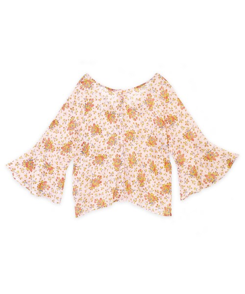 ボタンの付いている方はUネック、反対側はVネックになっており、どちらを前にしても着ていただけるデザインのショートガウンです。ボタンを外して羽織りとしてはもちろん、 ボタンを閉めてTOPSとしても、ボタンを後ろにVネックをフロントにした着こなしも◎ボリュームのあるフレアの袖が風が吹くたびに揺れて、腕を華奢に見せてくれます。 チューリップの花束の様な花柄は少し大ぶりですが、落ち着いた色味で派手過ぎない印象に仕上げました。