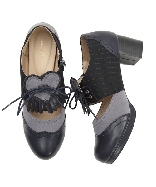 ハートのパーツが付いたPOETIQUEらしい可愛いデザインのオックスフォードパンプスです。脇ファスナーが付いていて着脱も楽です。