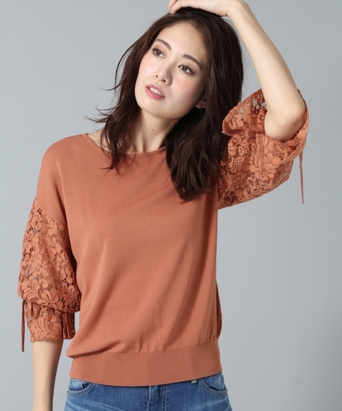 袖がレースになった異素材ニットです。 袖口がリボンになったフェミニンなデザインもポイントです。 フレアースカートでフェミニンに着こなして、デニムでカジュアルダウンするのもお勧め! 着回し力抜群のデザイントップスです。