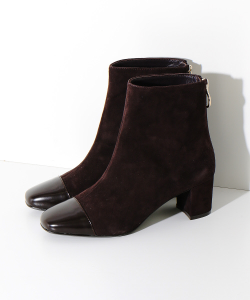 エナメル切り替えのスクエアトゥがクラシカルな印象のショートブーツ。バックジップのゴールドのメタルパーツが華やかなアクセントに。 6cmのチャンキーヒールは安定感があり疲れにくいのも◎ ノーブルな印象のネイビーにはトゥキャップ部分にカシメを打ってエッジを効かせました。
