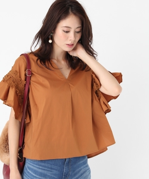 袖レースがポイントのヌケエリブラウスです。インでもアウトでも綺麗にスタイリングできます。 二の腕もカバーできるシルエットの袖でVネックでデコルテラインもスッキリ見えます。