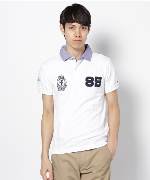 すっきりとしたシルエットのポロシャツは、大きなワッペンと布帛の襟がポイントです。
