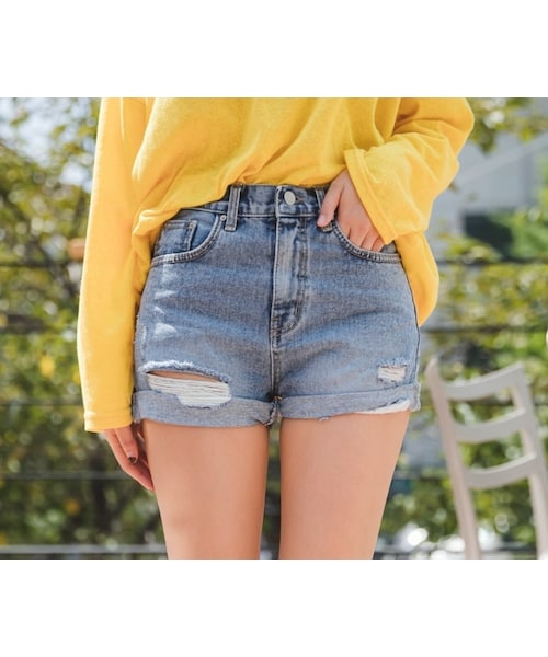 裾のロールアップでカジュアル感をプラスしたショートパンツです😍 さり気ないダメージ加工を施したヴィンテージ風ボトムス! ロールアップとセミハイウエストが脚長効果を発揮しスタイルアップ↑ 人気のセミハイウエストでクロップドTとも好相性です。