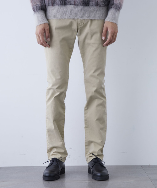 FACTOTUM JEANS(ファクトタムジーンズ) design 【スリムテーパードの定番チノパンツ】 定番展開のタイトなチノパンツ。 やや股上を深めにすることで、細身ながら穿きやすいシルエットになっています。 ヴィンテージ感のある色合い・あたり感が出やすいストレッチツイル生地は、 こなれた印象をコーディネートに与えてくれます。 シンプルなパンツなので、柄物ニットやカジュアルなパーカーといったアイテムとも相性抜群です。