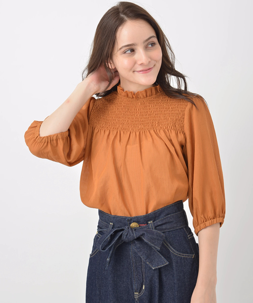 シャーリングのデザインがフェミニンな印象漂うプルオーバー。今旬のドルマンラインの要素をいれつつ、スタンドカラーでキッチリ感をだすメリハリのある一枚。 ひらりと動く裾のエレガントさも見逃せないポイントです。