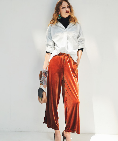 今っぽさを前面に打ち出せるベロア素材のライン入りパンツ。自然に広がるややフレアなシルエットは抜け感があって、穿くだけでこなれた印象に。ウエストゴムで着脱も楽なので、どんなときもコーディネートを楽しめそうです。カジュアルなカットソーに合わせるとほどよくアーバンなニュアンスに振ってくれ、レディライクなシャツやブラウスに合わせるとほどよくラフに仕上げてくれます。全体のバランスを統一してくれるため、迷ったときの一足として持っておきたいアイテム。