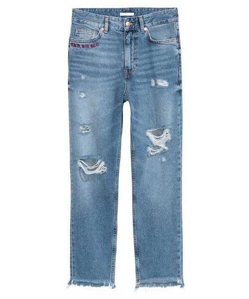 5-pocket jeans in washed denim with heavily distressed details. Embroidery details at top, regular waist, and zip fly with button. Straight legs with raw-edge hems.