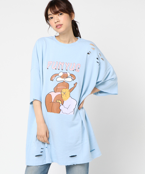 NONCHELEEE(ノンチェリー)氏による ポップなイラストが大胆にプリントされたビックTEE。 ワンピとしても着用できるほどの ビックサイズなので様々なコーデに活用可能♪ 肩や裾部分に施されたクラッシュ加工が目を引くアイテム。 袖が切りっぱなしになってるのもポイント☆ イラストレーター NONCHELEEE(ノンチェリー) cero,ZEN-LA-ROCK,嫁入りランド, YOUR SONG IS GOODなど、 音楽関係を中心にCDジャケット、TEEシャツ、 フライヤーにアートワーク、 タイポグラフィー提供。 各種お祝い事、店舗看板など幅広く活動中。