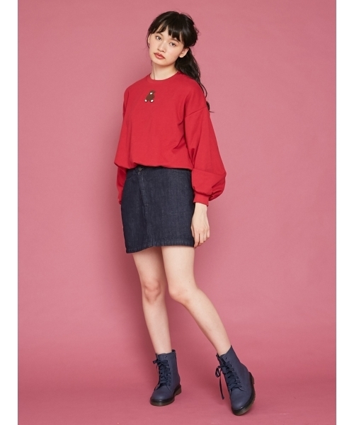 " シンプルで 着回しやすく、 デニムミニスカート。 フロントは シンプルに、 でも バックスタイルには ◯と▽の ユニークなポケットが! merry jennyらしい あそび心の効いた itemです◎