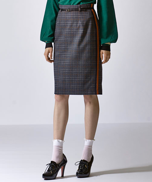 トレンドのグレンチェックをカジュアルにアレンジした素材を使用したタイトスカート。アクセントとしてサイドにラインテープを施し、エッジの効いたデザインに仕上げました。 膝が隠れるミドル丈なので、大人の女性でも着こなしやすい一着となりました。 ストレッチ性の高い素材なので、タイトシルエットでも動きやすいもの魅力。 程よいタイトシルエットなので、着こなしの幅が広く、シャツをインしたり、カーディガンを合わせたり、ジャケットを羽織っても、様々なコーディネートに対応出来ます。 裏地有りです。