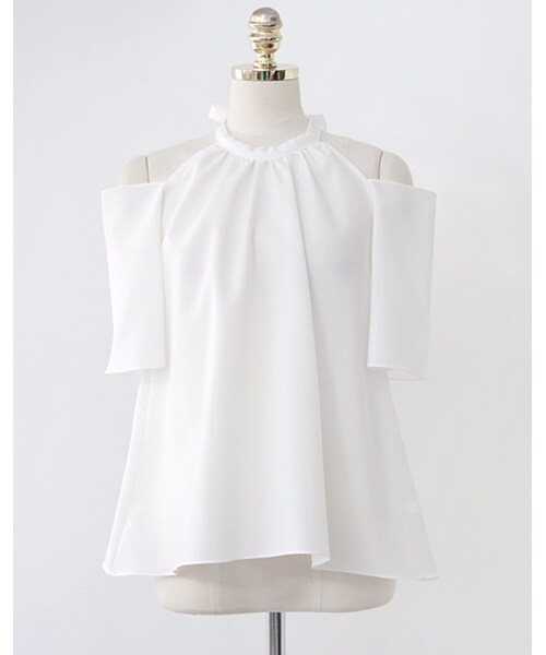 大胆なショルダーカットアウトがポイントになったブラウス☆ アメリカンスリーブ調のホルターネックデザインがセンシュアルな印象を与えます。 女性らしさ満点の肩開きデザインがたまらなくセクシー。 無地のすっきりデザインなので柄のあるボトムスと合わせるとGOOD◎