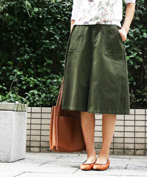 Salle de bal 別注のチノベイカースカートが入荷致しました。生地に厚みを出した質感になっております。 スプリングコートに合わせてみたり、トップス次第でどんなスタイルにも使えるチノスカート。 Aラインでフェミニンなシルエットに丈は膝丈でトレンド感満載なスカートです。 サイドポケットは程よい深さでとても使いやすいです。