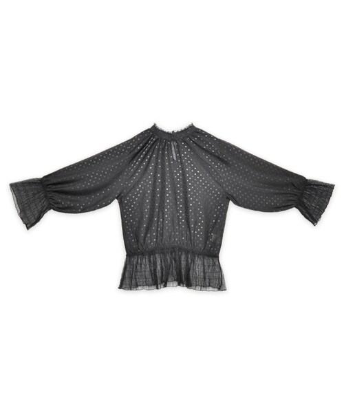 肌馴染みの良いさらりとした柔らかな生地は、よく見るとドット柄に♪光の当たり方によって模様の見え方が変わります。 袖口と裾のぺプラムにはシャーリングを施したチュール生地を組み合わせました。 スタンドカラーの首元には繊細なレーステープをあしらい、トレンドのクラシカルな雰囲気に仕上げました。 涼しげな秋のスタイルに是非おすすめしたい、さり気ない可愛らしさが詰まった1枚です。