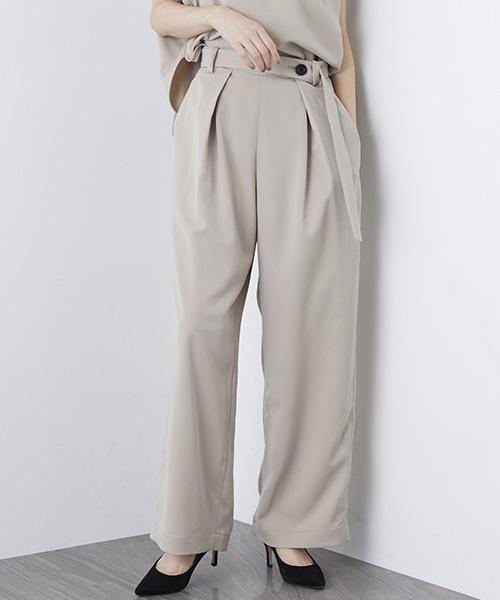 ◆トレンドのラグジュアリー感漂うワイドパンツ◆ 【Fabric】 今季らしい起毛タッチのラグジュアリーな表面感とイージーケアなポリエステル素材が初秋まで嬉しいテキスタイルです。 緩やかなフレアが美しく演出できる肉感と柔らかさが特徴的。ベルト付きのワイドパンツ。 【Desigen】 高めのウエストで履けるのでショートトップスとも相性抜群で腰の位置も高く見えるのでスタイルアップ効果もあります。 こだわりのフリュイドベルトのウエストデザインはトップスをインしたときにポイントとなりこなれた雰囲気に。 歩くたびに揺れる裾のシルエットが軽やかでエレガントな一着です。 【Coordinate】 実用的で着慣れた美しいシルエットだからこそTOPSはラメやボリュームシルエットなどのトレンド要素の高いアイテムがおすすめ。 洗濯:洗濯機使用可(ネット使用)