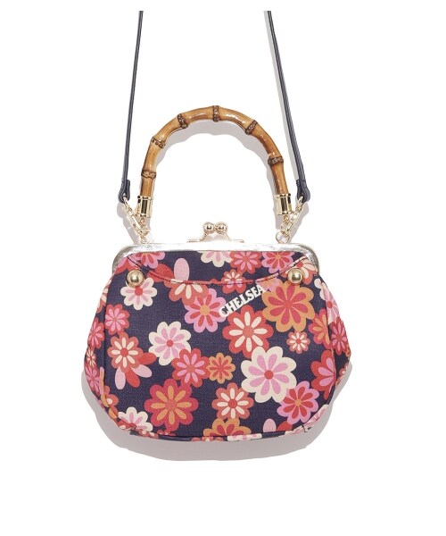 パッケージと同じ、ポップなフラワー柄が街の視線をキャッチする、「CHELSEA(チェルシー)」とのコラボレーションアイテム。がま口フォルムとバンブーハンドルで、レトロムードが高まるデザイン。ショルダーストラップが付いた2WAY仕様です。※商品画像はサンプルのため、色味やサイズ等の仕様に変更がある場合がございますので、予めご了承ください。