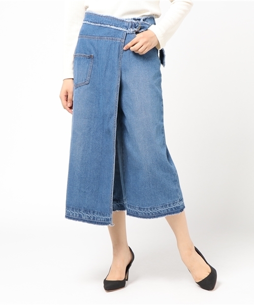 スカートのようなフロントデザインは、実は生地を重ねたラップ風デザインに。ふわっと足を包み込むワイドシルエットのパンツをさらに女性らしくデニムです。普段パンツ派の人でもスカートのように着こなせるのでデイリーの着回しの幅も広がりますね。足のラインをはっきりさせないので体型カバーもばっちりです。ウエストにセッティングされたベルトはフリンジになっている今年らしいディティール。ビンテージのような色落ちとワンポイントでつけられたポケットもアクセントになっています。
