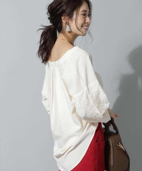 袖の同色刺繍がポイントのブラウスです。 同色刺繍なので目立ちすぎず、シックな1枚。トレンド要素のあるボリューム袖も◎ 抜け襟とスキッパーでデコルテラインもきれいに見えます。
