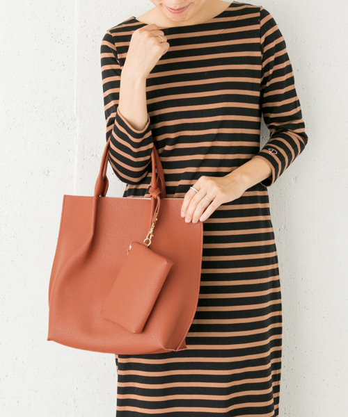 A4サイズがすっぽり入るトートバッグ。シンプルでアウトステッチがほどよいアクセントに◎無駄のないすっきりとしたデザインで内ポケットはないのですが、代わりになる小さなポーチ付き。取り外しもできるので、毎日使うような小物を入れておいて他のバッグにもそのままイン♪そんな使い方もできちゃう優れものバッグです。 ※A4サイズ収納可能 重量 : 約490g