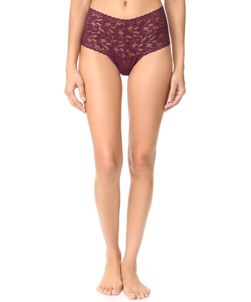 A high-waisted Hanky Panky thong in scalloped lace. Lined gusset. Sheer. 79% nylon/21% spandex. Hand wash. Made in the USA.