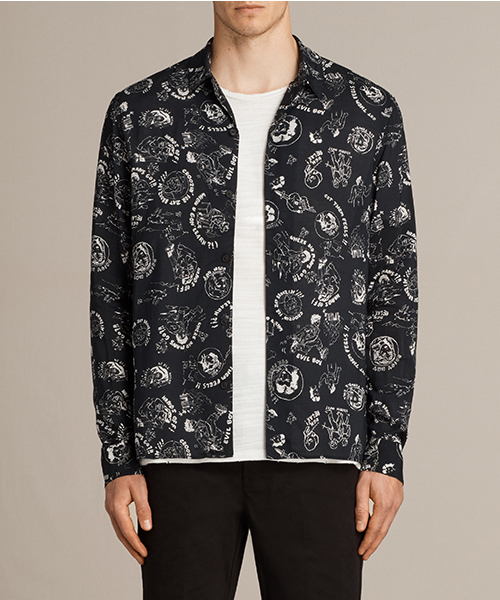『17AW 新作アイテム』 FEELS LS SHIRT (プリントシャツ)オールセインツで人気カテゴリ、定番スタイルのオープンカラーのレーヨンシャツ。ペンキとインキを使用してに描かれたモチーフは、50年代アメリカの漫画風の軽やかな雰囲気の中で、悲しみ、悪徳と美徳を表現。◇ALLSAINTS(オールセインツ)について デジタル思考と革新的なアプローチで世界的にブランディングを展開するプレミアムブリティッシュファッションブランド。 イーストロンドンに本社を持ち、ウィメンズウェア、メンズウェアならびにアクセサリーを自社にてデザインを行っている。 全世界で 3200 人の従業員を有し、ストアデザインや店舗建築まで全てのブランドエクスピリエンスを自社で作り出している。
