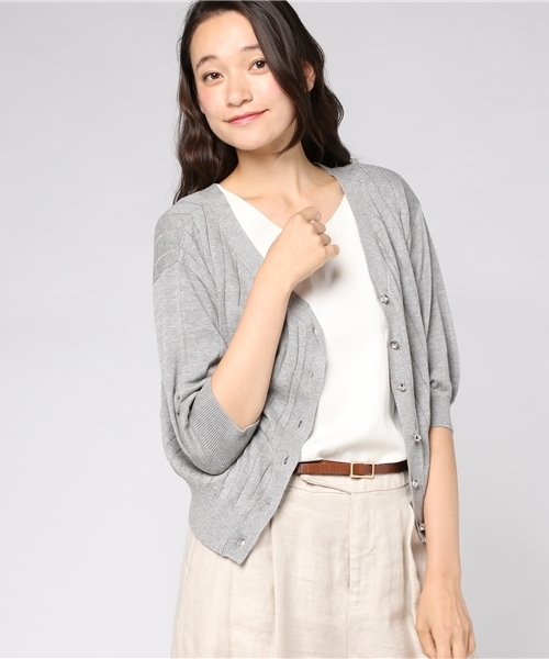 前後どちらをフロントにしても着られる2way仕様のニットカーディガン。コンパクトなサイジングながらも伸縮性があるので程よいフィット感で着られ、どんなボトムと合わせてもバランス良く決まるのも嬉しいポイント◎肩に掛けただけのこなれラフな着こなしから、前を全部閉じてプルオーバーなアレンジまで、多彩な表情が楽しめます。