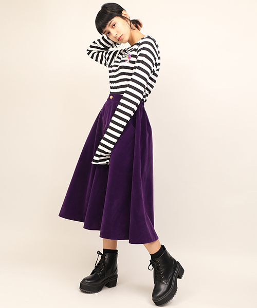 膝が隠れる丈のふんわりしたミモレ丈のスカートを 秋冬定番のベロア生地で仕上げました♪ サイドにはポケットもついており、 ウエスト部分はゴムになっているので ストレスなく履いていただけます。 スカートにボリュームがあるので、トップスはスッキリとした シルエットのモノがオススメです☆