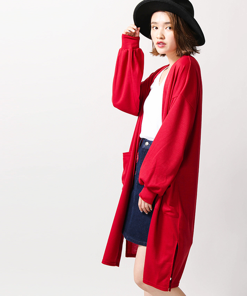 単色仕様で仕上げたロングカーディガン。ゆとりのあるボリュームスリーブが、手軽に着こなしのアクセントになります。 程よいロング丈で、落ち感の綺麗に出るシルエットが特徴。ライトアウターとしてTシャツやカットソーなどに手軽に羽織って頂けるひと品。シンプルなデザインなので、どんなスタイルにも合わせて頂けます。 今季はベレー帽やチョーカーなど、小物で遊びを効かせたコーディネートもオススメです。