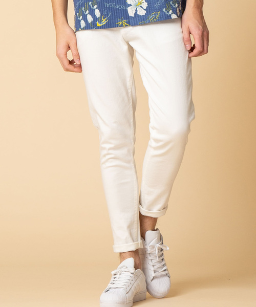 美脚シルエッにこだわった大人のための8分丈キャロットスキニ- ホワイトパンツのクリ-ンなイメ-ジを洗練されたスリムフィットで決定付ける一品。 やや肉厚でハリのあるカツラギストレッチ素材が作るシャ-プなシルエットがポイント。 厚手でハリがある素材だからこそテ-パ-ドラインもすっきりとシャ-プに見えるのが必然。 ヒップとワタリ部分に絶妙なゆとりを施したキャロットシルエット。 ヒザから裾へかけてのテ-パ-ドラインも絶妙です。 あえての8分丈でストリ-ト映えする極上シルエットを是非お試しあれ! 商品番号:02168178