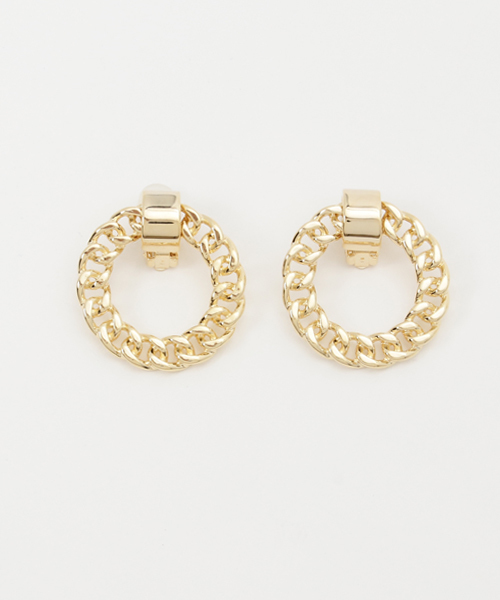 大ぶりのチェーンモチーフがインパクトのあるイヤリング。丸みがなくエッジのきいたフォルムにこだわっているため、クールな印象に。