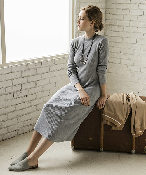 ランダムなワイドリブが立体感があり体のラインをひろわず程よいフィット感です。程よく詰まったクルーネックと裾が広がるフレアーシルエットが、一枚でこなれた印象で着こなしていただけます。袖はクシュっとさせて着る長め丈です。