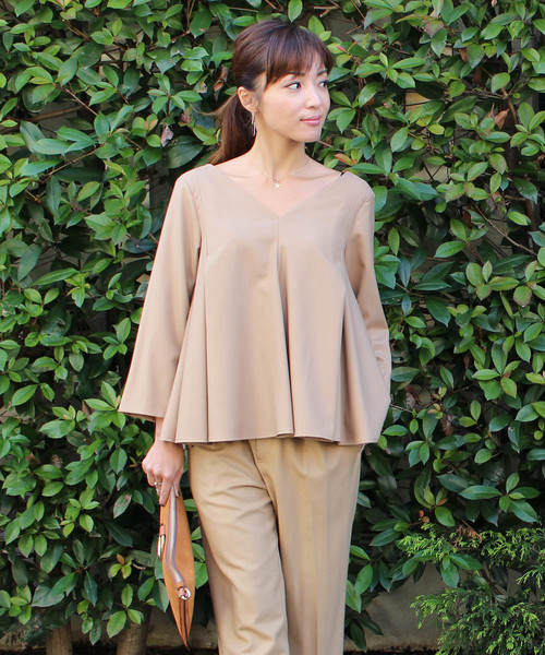 タックフレアーのふんわりとしたラインのTOPSです。下着の見えない程よいあきの両Vネックで大人の女性らしさを演出します。<お袖はストンとした綺麗なラインで9分袖となっております。OFFの日にはタイトなニットSKやRELAX のパンツとのコーデがおすすめです。