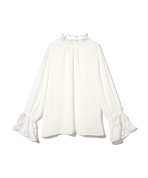 きゅっと結んだ袖のフレアデザインがポイントのトップス♪ プチハイネックデザインがクラシカルな雰囲気に◎ ワンカラーでスタイリングに取り入れやすいアイテム◎