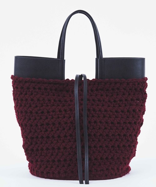 【LAUGOA(ラウゴア)】 ざくざくと大きく編んだニットとハンドル周りのかっちりとした素材の切り替えしがバランスのいいハンドバッグ。ミニマルなボディにさらりと垂らしたストリングがポイント。ハンドルは手元を美しく見せてくれる細丸タイプで、かつ持ちやすいのも◎手編みならではのクラフト感とデザインのソリット感が絶妙にマッチしたLAUGOAらしい冬のマストアイテムです。