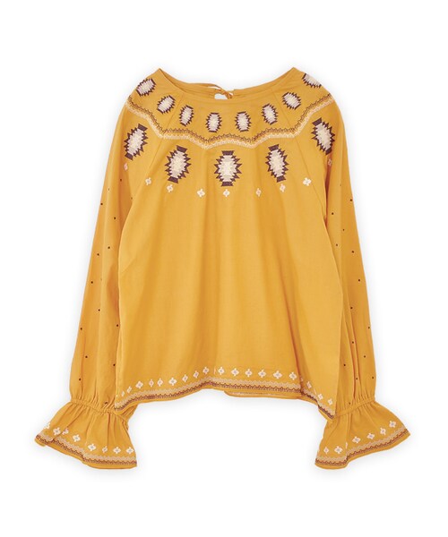 カタログ表紙アイテム♪実りの秋をイメージしたブラウス ノルディックニット等に見られるネックから放射状に広がる柄から受けたインスピレーションを元に、flowerオリジナルの刺繍ブラウスに落とし込みました。 ネック周りを縁取る繊細な刺繍に、実りの秋をイメージした落ち着いたカラーリングで大人可愛い仕上がりに。袖にはドットの刺繡、袖口と裾にも細かな刺繡をほどこしています。 ショートパンツやデニムにさらりと合わせるのはもちろん、着丈が長めなのでスカートにウエストインしてふわっとブラウジングして着て頂くのもおすすめです。