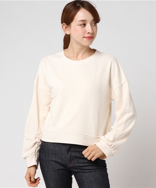 裏毛のプルオーバーです。綿ポリエステルの柔らかな裏毛素材を使用しています。オーバーサイズシルエットで、リラックスした着用感で袖に入ったドロストで、ギャザーをお好みで寄せることができます。ワイドパンツやスカーチョと合わせたカジュアルスタイルがお勧めです。