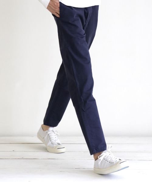 【日本製】~made in Japan~ ~男女兼用(ユニセックス)~伸縮性のあるツイル素材を使用したテーパードパンツです。 すっきりと美しいテーパードシルエットはトップスをタイトにすれば、上品で 洗練された印象に。オーバーサイズのトップスを合わせればカジュアルで今っぽい印象にと 合わせるアイテムによって様々なスタイルを楽しめます。 特殊な洗い加工を施す事で、程よいアタリが出て風合いよく仕上がっています。 メンズ、レディース、ユニセックスで履いて頂けます。