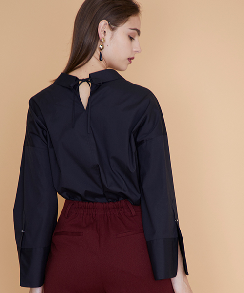 This Item is Made in YAMAGATA.ワイドスリーブがアイキャッチーなシャツブラウス。きちんと感がありつつもヌケ感のあるスキッパーカラーがこなれた1枚。大きく広がったワイドスリーブの袖口にはスリットをいれ、軽やかな印象に。ボタンにはシンプルなシルバーの鋲を使用し、モードなアクセントになっています。また、首元後ろにもスリットを施し、リボンのアクセントを加えることで、シンプルながら女性らしい仕上がりに。1枚で着てもさらりと着心地の良い、肌なじみの良い生地を使用。適度なハリ感と、立体的な仕立てで美しいシルエットに。きれいめテーパードと合わせてオフィス着でも、デニムやラインパンツ等と合わせてオフの日にも着用頂けます。