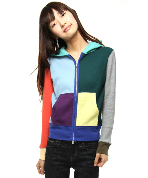 柔らかくて肌触りの良いコットンサーマル素材を使用。インパクト大なクレイジーパターンはなんと11色!女の子らしいキュートなカラーリングで、着ていて楽しくなってしまうサーマルパーカーに仕上がりました。 人気のオーバーオールと合わせて。シンプルなスタイリングのアクセントとして合わせたりとカジュアルスタイルにバッチリな1枚です。軽くて薄手なパーカーなのでクルクル丸めてバッグにINして持ち歩いたりと、活躍間違いなしのオススメアイテムです。 品番:13-13-0831-654 原産国:日本 モデル着用サイズ:ONE SIZE model:yukari nameki(conditiongreen) H168 B78 W56 H83