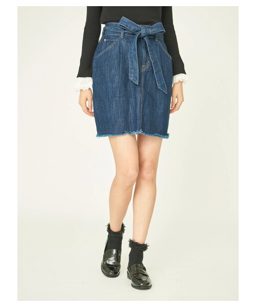 USA COTTONのクオリティの高さが特徴のデニムスカート。 台形シルエットは、美脚効果も期待大◎ 裾のフリンジや、ウエストのリボンなどのディテールにもこだわりました。トップスを選ばず幅広く使えるので、毎日のスタイリングに重宝する頼もしい1枚です。