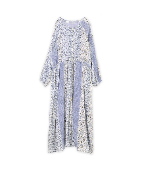 カタログ掲載のワンピースが登場!秋の穏やかで涼しげな空気感を表現したテキスタイルが魅力的なアイテムです。 様々な柄を組み合わせながらも、まとまりが出るように色や柄の配置にこだわりました。 素材はしぼ感がありさらっとドライな肌ざわりのコットンクレープを使用。 腰紐には金色の鈴が付いています♪ぎゅっと絞ってブラウジングしても、ラフに垂らして着ても◎前開きなので羽織としてもお使い頂けます。透け感のある生地ですが、別布のインナー付きなので安心です。 少し肌寒くなるこの時期にぴったりの1枚です。