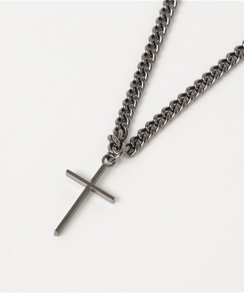 チェーンのトップに細いクロスのトップが付く。 控えめなデザインがらしっかり主張してくれる クールなネックレス。丸チャームが付く