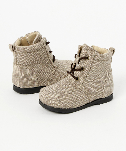 厚手で丈夫なツイード素材を使用したブーツです。ツィード素材におでこのコロンとしたフォルムのレースアップが、どこかトラッドな雰囲気を感じさせます。 シンプルなデザインなので男女問わずに使えます。 内側のサイド部分にファスナーを付けることで、脱ぎ履きしやすくなっています。 ファスナーにはファスナーよけもついていて、直接肌にあたらない仕様になっています。 かかと部分にはクッションがついており、歩行時のサポートをしています。 ※サイズ表記について 130cm⇔13.0cm 140cm⇔14.0cm 150cm⇔15.0cm こちらが正しいサイズとなります。