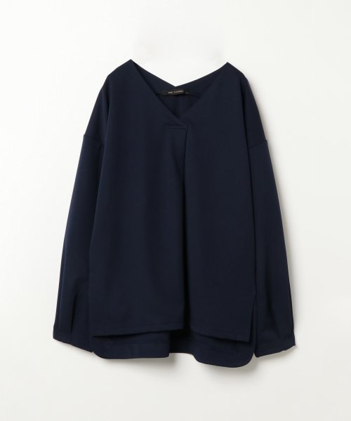 ツイルのようなカットソー生地を使ったプルオーバー。開きのきれいなVネック、フロントのタックでブラウス見えするきれいめ感に仕上がっています。サイドスリットの効果でワイドボトムと合わせても収まりがよく、後ろ下がりのシルエットは前だけをボトムINしても様になります♪[クリーニング]洗濯機洗い可(弱く)ウェットクリーニング(W)洗濯の際はネットを使用してください
