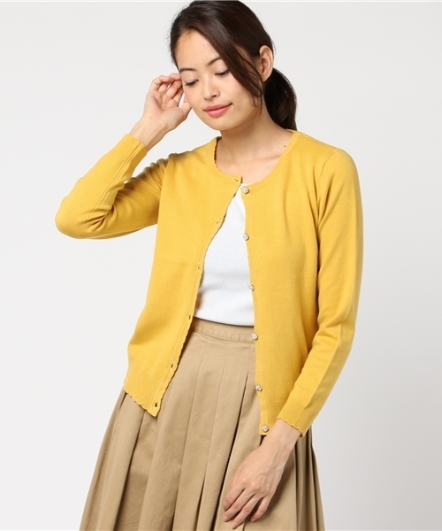 フロントのパール×ビジューボタンで愛らしい印象に。 定番のカーディガンが秋冬色で新登場。衿ぐりとフロント、裾のスラップ始末もコーデのポイントに。 通勤アイテムとしても好印象のアイテムです。 洗濯:手洗い可